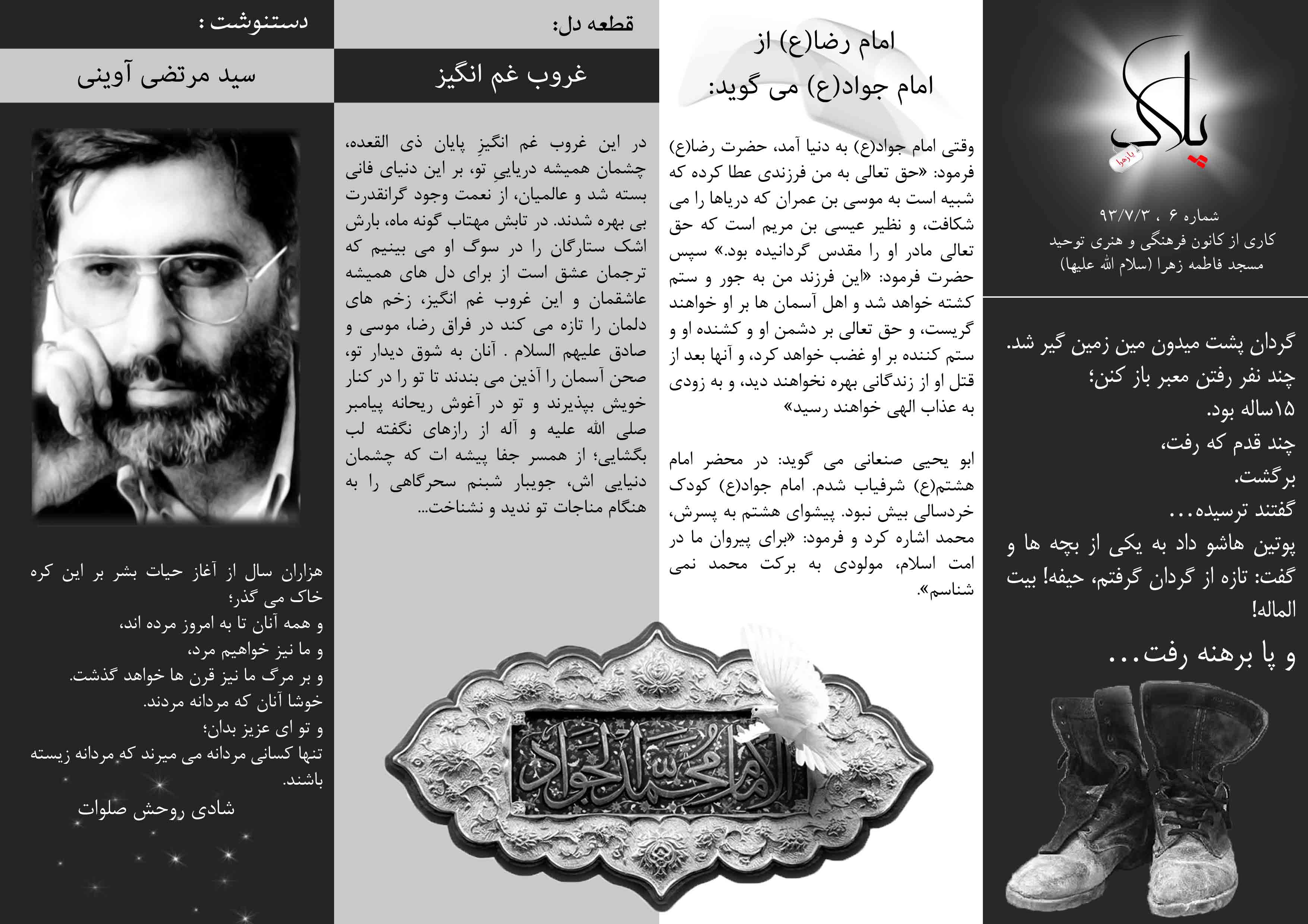 با سلام خدمت دوستان عزیز. ما چند نفر تصمیم گرفتیم که یک نشریه واسه خانه شهید بزنیم (که پیشنهادشو یکی از دوستان مسئول به ما داد، ماهم قبول کردیم!) گفتیم دور همی یک کار مفیدی کرده باشیم. حالا بگذریم. میخواستیم بگیم که اگه این نشریه رو بخونید و نظری بدید ما خیلی خوشحال میشیم مشکلاتشم رفع میشه مطلابش هم بهتر می شه! البته ناگفته نمونه که این نشریه توی خونه شهید پخش میشه ولی خب به دلیل مشکلات مالی سیاه سفید با کیفیت نه چندان دلچسب. اگه میخواید کمکی بکنید (مالی) با آقای تقوی تماس بگیرید یا اگه دوست دارید مطلبی، دلنوشته ای، شعری بدید اونو به این آدرس ایمیل (pelakname@Gamil.com) کنید اگر هم ایمیل ندارید همین جا بندازید توی نظرات...